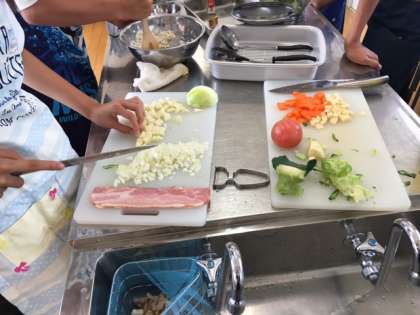 ハンバーグとミネストローネ作りです。班で手分けをして、一生懸命作っています。