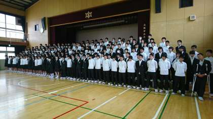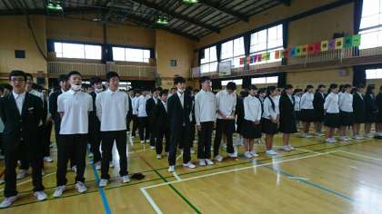 式典の全体的な流れの確認と全体合唱の入退場と歌の練習をしました。いよいよ迫ってきました。