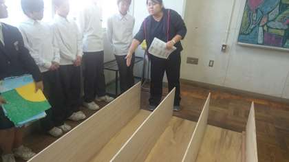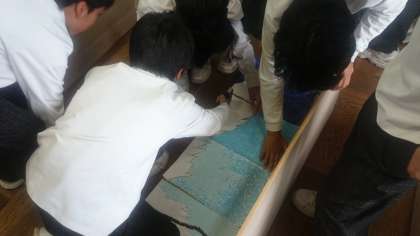1年生では、全員が協力して「ちぎり絵」を製作しています。今日は、屏風に1・3組の作品を、プロジェクトリーダーが貼り付ける作業をしました。明日は2・4組が屏風の反対側に作品を貼り付ける予定です。どんな作品になるかはお楽しみです。