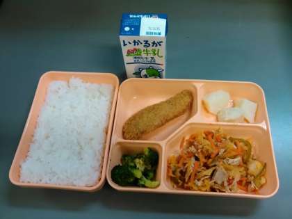 豚肉のケチャップ炒め サーモンフライ 粉ふきいも ブロッコリーのサラダ 米飯 牛乳