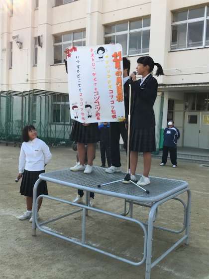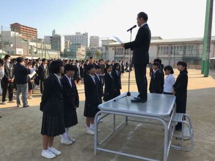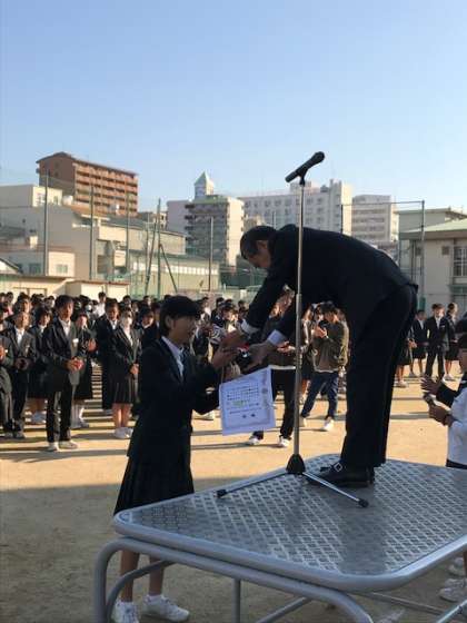 11月6日、全校集会にて賞状伝達と生徒会役員から11月の目標が発表されました。賞状伝達では大阪市総合文化祭において本校茶華道部が出品した作品と、日本拳法全国大会で3位の表彰が行われました。
