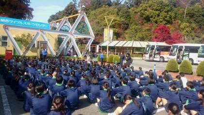 関西サイクルスポーツセンターに到着し、係の方から説明を受けています。府下からたくさんの小中高校生がバスで校外学習にきています。