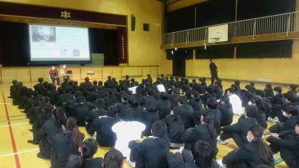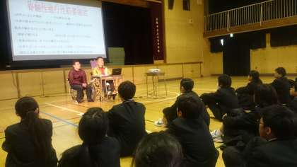 今日12月4日から、世界人権宣言が発表された12月10日までは、人権週間です。1年生では、障がい者理解のために、車椅子で生活しておられる鈴東裕己さんに来ていただいて、お話をしていただきました。