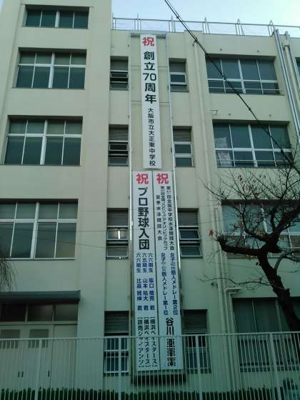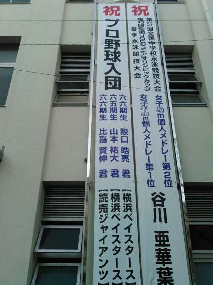 今年度のプロ野球ドラフト会議で、本校卒業生が三名指名され入団が決まりました。この栄誉を祝し、本校同窓会「暁光会」より懸垂幕が寄贈され本館校舎壁面に掲揚しましたのでお知らせします。
