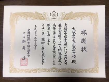 学校にも「全国納税貯蓄組合連合会 会長感謝状」をいただきました。