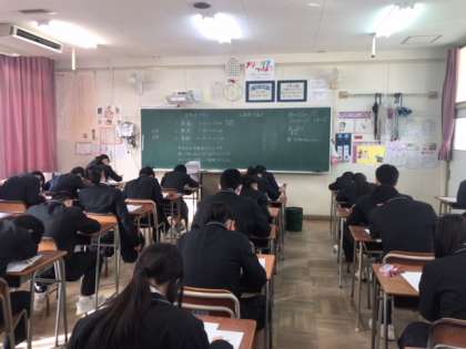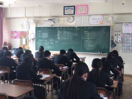 三年生の学年末テスト2日目で、本日は技術家庭科、数学、英語が行われました。休み時間は周囲に答えを確認したり、次の教科の勉強をしたりと、必死な様子が見られました。