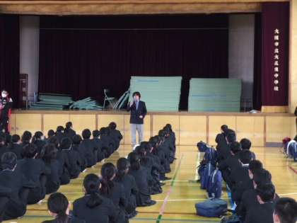 学年末テストを終えて息つく間もなく体育館に集合し、進路s指導主事より注意事項などが話されました。その後、それぞれ学校ごとに分かれて出発しました。