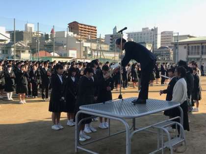 また、生徒会役員から今月の目標の発表と、朝のあいさつ運動(登校時の通用門)で特に元気よくあいさつをした人が発表され、手作りのメダルが授与されました。