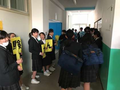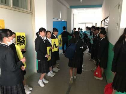 本日、朝の登校時に明日の私立高校の受験に向け、1.2年生の生徒会役員が中心となり3年生に向けて応援メッセージを送りました。3年生の皆さん「受験がんばってくださ〜い!」