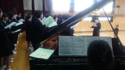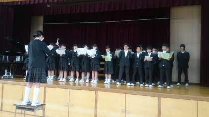 今日2月16日は、午後の進路学習の後、2組が体育館を使って本番を意識して合唱練習をしました。