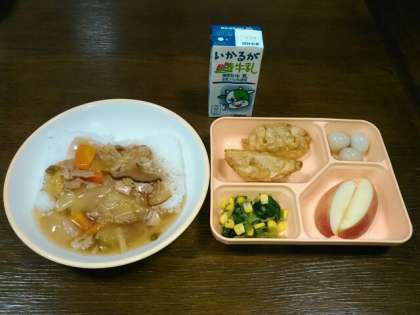 中華丼・うずら卵 揚げギョーザ チンゲンサイとコーンの炒めもの りんご 米飯 牛乳