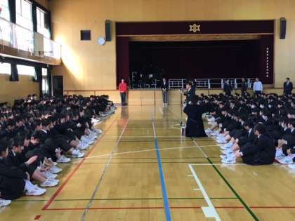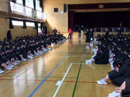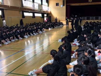 3年生が向かって左側に、1・2年生が向かって右側に、お互い向かい合って座っています。