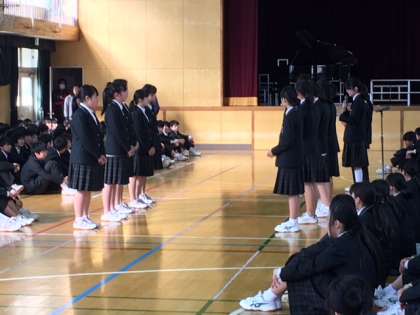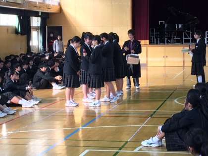 在校生の代表が、3年生各クラスの女子の代表の胸にコサージュをつけてあげました。