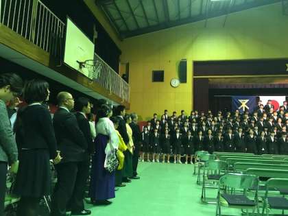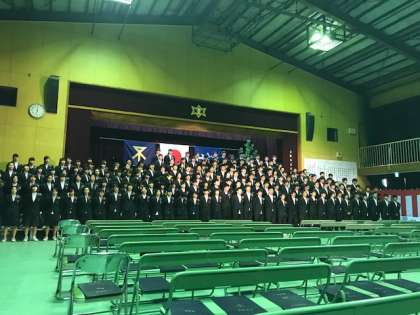 仰げば尊し、花、蛍の光と、卒業生が舞台で歌います