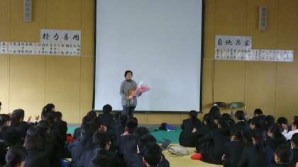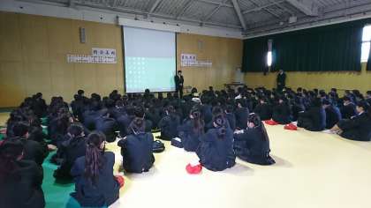 1年生最後の学年集会では、春休みの注意や2年生に向けての心構えの話がありました。