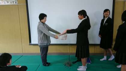 今年度末で退職する鳴尾先生の指揮のもとで「時の旅人」を全員で歌い、その後クラスの代表から賞状と色紙・花束が、鳴尾先生に送られました。