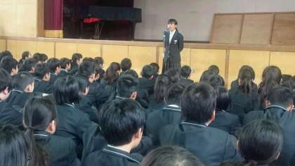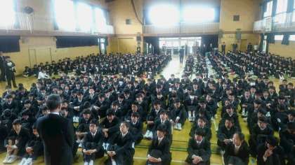 体育館で新年度一学期の始業式が行われました。学校長の挨拶のあと生徒指導主事からの話と、生徒会長からのメッセージがありました。最後に賞状伝達をして、始業式は終わりました。