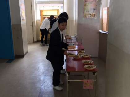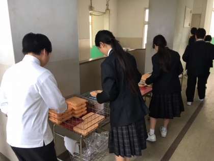 並んで順番に自分でおかずや牛乳等をとっていきます。