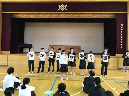 修学旅行実行委員のみなさんから、スローガンの発表と心構えの説明がありました