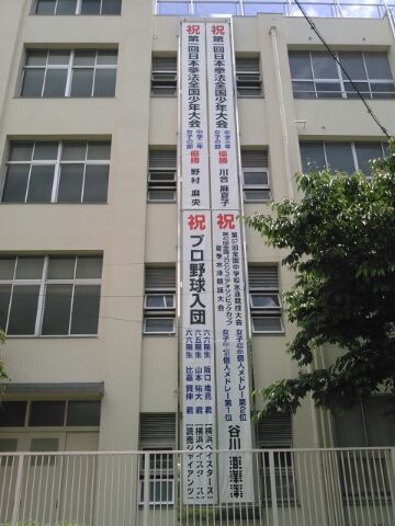 先日行われました日本拳法全国少年大会で、本校2年生、3年生の女子生徒がそれぞれ学年別の部において優勝いたしました。これを祝しまして、本校同窓会「暁光会」より懸垂幕を寄贈していただきました。本館正面外壁に取り付けましたので、本校へお越しの際にはご確認ください。