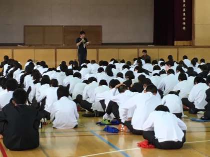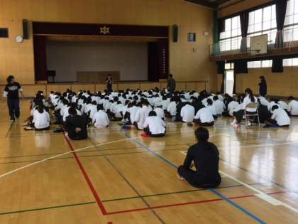 5限目に体育館で、しおりをもとに一泊移住の説明を行いました。