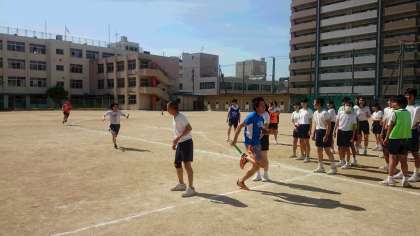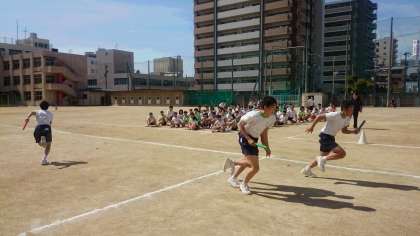 全員リレーではバトンを繋いでみんなが全力で走り抜けました。途中で各クラスの担任または副担任のどちらかが走り、つなぎました。