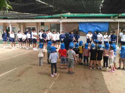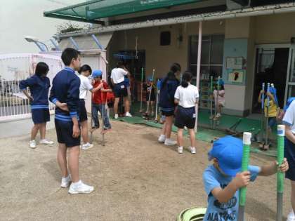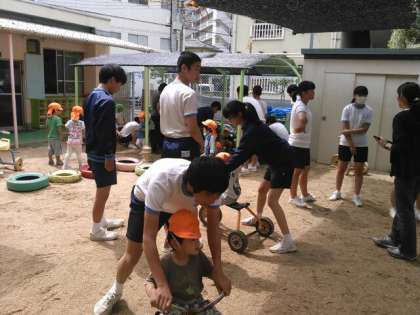 3年3組は大浪保育園でふれあい保育を行いました。最初にみんなであいさつをして、園児と竹馬や三輪車、鬼ごっこなどで遊んであげました。