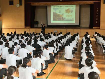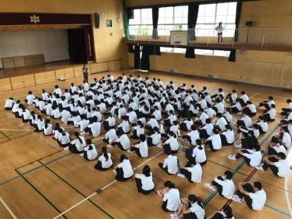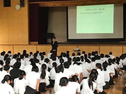 3年生では本日の1限にホロコーストについて、平和・人権学習を体育館で行いました。