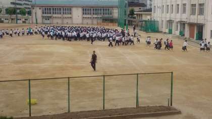 登校した生徒を全員運動場に集め、全校集会の形式をとって、もしもの場合の行動についての注意を行いました。