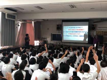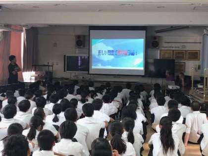 2年生全クラスが集まり、集中して熱中症について学んでいました。