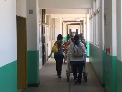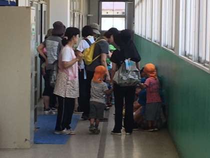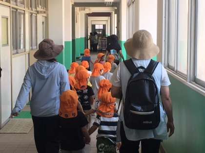 本日午前10時過ぎ、大浪保育所の津波に対する避難訓練で、保育所の幼児全員が本校の東門より避難して入り、4歳児・5歳児が南館4階の理科室前まで移動する訓練をしました。