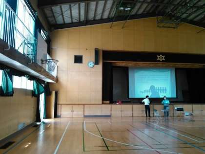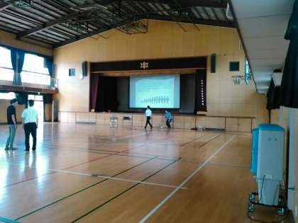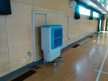 今までは、体育館で映像を見る時は、暗幕を閉めてとても暑い状況でした。そこで、暗幕を閉めずに窓を全開しても、はっきり映る高性能のプロジェクター(写真上)と、室内用の大型冷風機(写真中)を購入しました。少しでも、体育館の暑さ対策に役立てばいいですね。