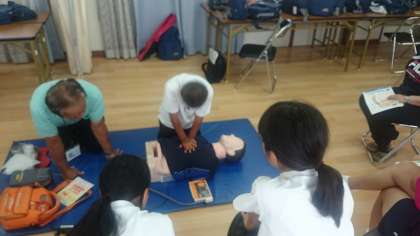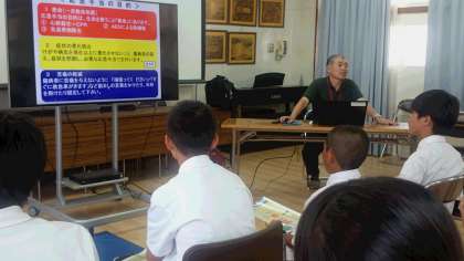 7月20日の1学期終業式の午後、各クラスの保健委員の生徒を対象に、大阪市消防振興会の方によるAEDを使った救命講習を行いました。猛暑のなか、参加した生徒たちは、熱心に講演を聴き実習に取り組んでいました。