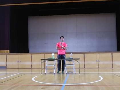 体育館で、ご自身の体験談を取り入れ、継続することの大切さ、気持ちが折れた時の心の持ち方立ち直り方など講話していただきました。
