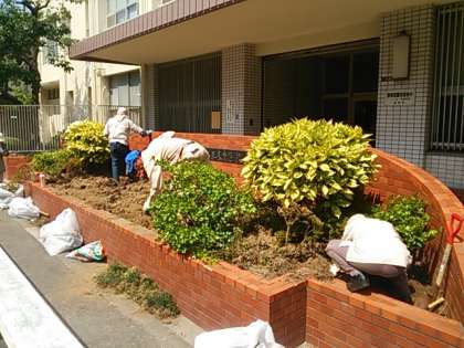 今日の午後、学校元気アップ地域本部の取り組みで、正門の緑地が整備されました。