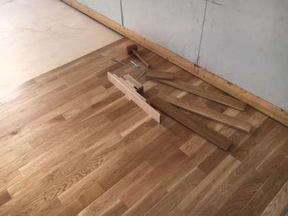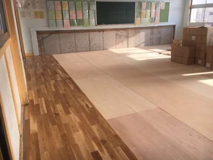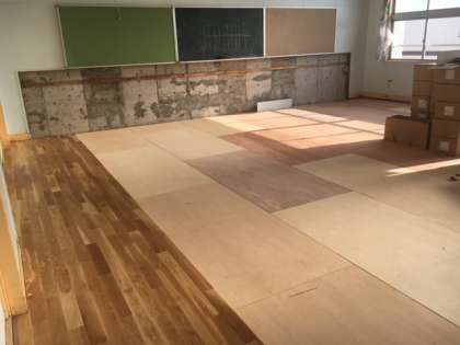 1年生の教室(2組〜5組)は、床板の上にフローリング材が順次張られていっています。とても美しい雰囲気が出てきています。