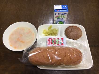 焼きハンバーグ 豆乳コーンスープ キャベツのカレーソテー パン パン添加物 牛乳