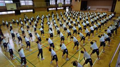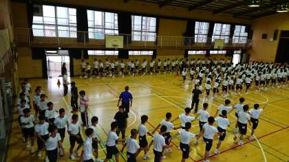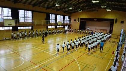 ラジオ体操の練習をしたり体育館内を行進したりしました。