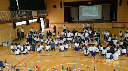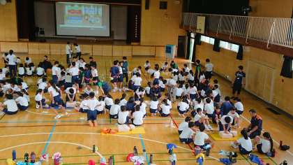 最後に、各班で交代しながら心肺蘇生法(胸骨圧迫・人工呼吸)・AEDを10分間続けて行いました。一人だと体力的に続かないこともありますが、チームで行えば長くつなげることができると消防署の方がおっしゃっていました。積極的に参加して全班やりとげることができました。