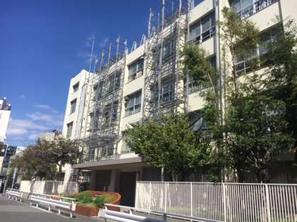 室外機の入れ替えも必要なため本館校舎には屋上まで足場が組まれています。約1か月かかります。