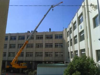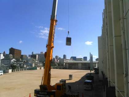 体育大会が終わってすぐ、調理室、音楽室、LL教室、パソコン教室、相談室のエアコンの付け替え工事が始まりました。中間テスト前の三連休には、大型のクレーン車が屋上の室外機の交換をしていました。冬以降、前記の教室の空調の効きが良くなると思います。また一つ、校内の設備が新しくなり快適な環境になります。