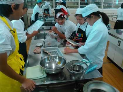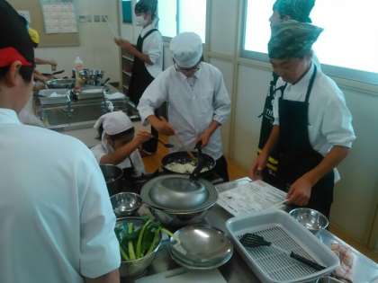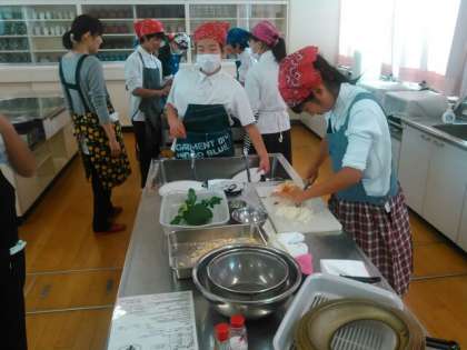 今日は1年2組で調理実習です。ちょうど、玉ねぎを刻んでいるところで、目がウルウルしそうになりました。刻んでいる人、頑張れ。