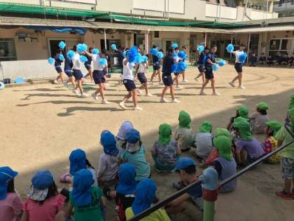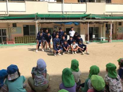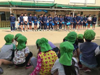 体育大会で行ったダンスや集団行動を発表したあと、園児と交流して楽しい時間を過ごしました。
