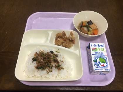 鶏肉のたつたあげ あつあげと野菜の煮もの おかかなっ葉 米飯 牛乳