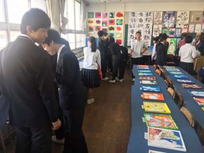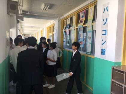 パソコン室前(パソコン部)、美術室(美術科、美術部、特別支援学級)、多目的室(2年生学年展示)の様子です。