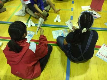作り上げた紙ヒコーキを飛ばし合いして、成績優秀な班と一番よく飛ばした人には、賞品が渡されました。