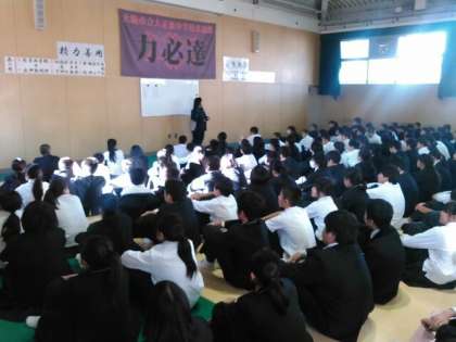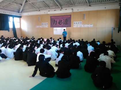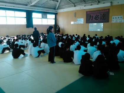 一年生の校外学習は、大阪メトロ(地下鉄)を使った大阪市内の班別オリエンテーリングです。武道場で最後の注意を聞きました。
