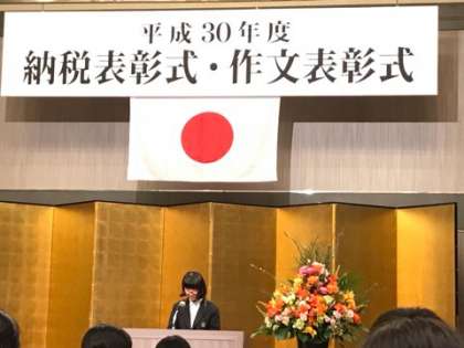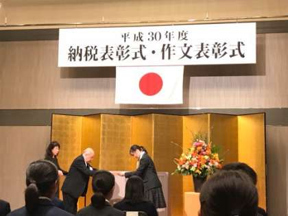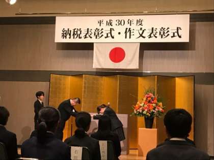 昨日、アートホテル大阪ベイタワーホテルにて、平成30年度「税の作文」の表彰式が行われ、受賞した3年生3名が出席しました。
