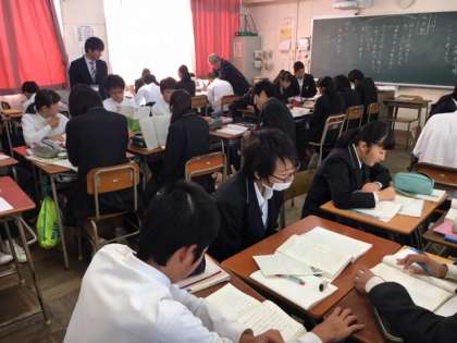 「平家物語」の音読を班で行わす等、工夫が見られました。大阪市教育センターから指導教諭に来ていただき、参観およびご指導を受けました。
