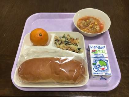 鶏肉と野菜のケチャップ煮 ほうれん草のグラタン みかん パン 牛乳